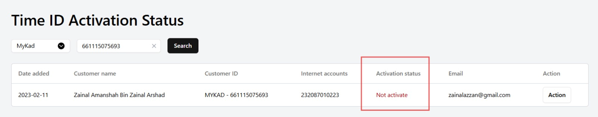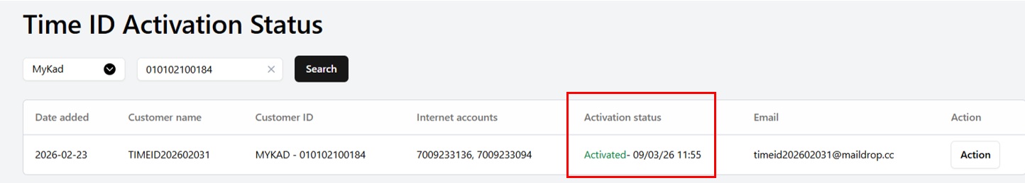 Navigate to Time ID → Activation Status, then search by customer ID.