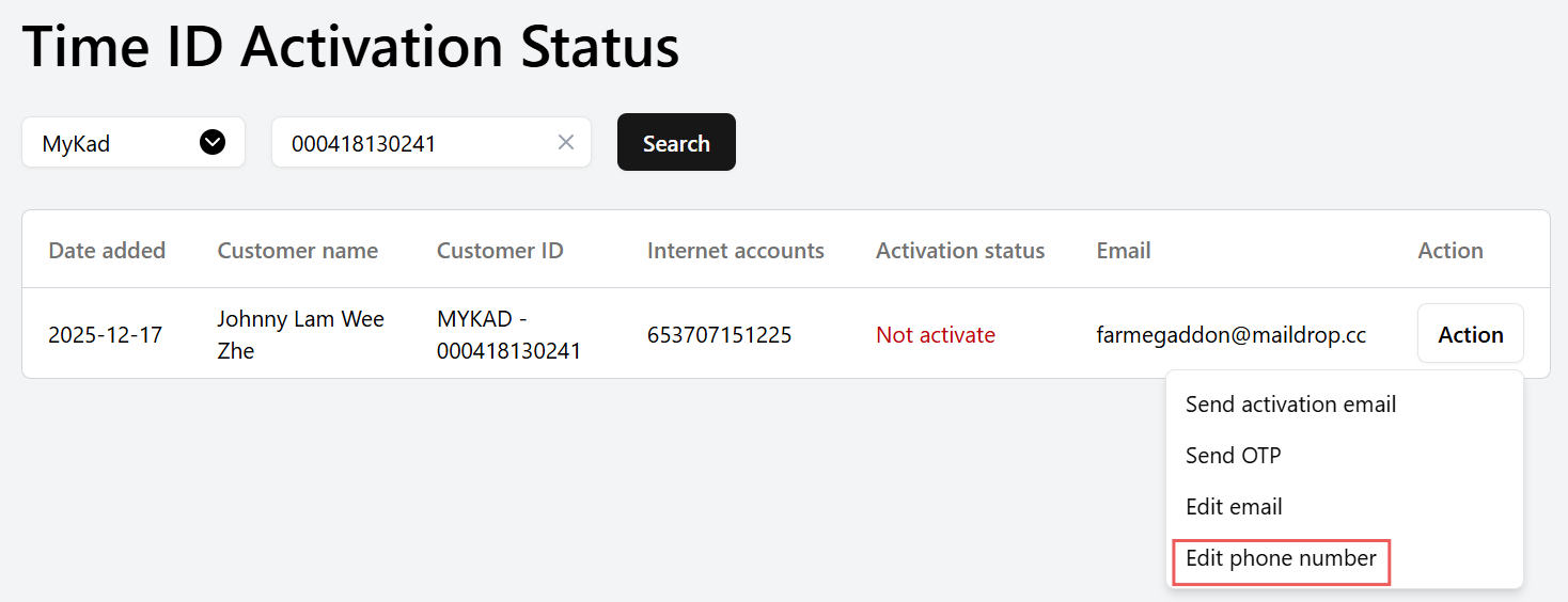 Select Edit Phone Number in the Time ID action menu to change the registered number.